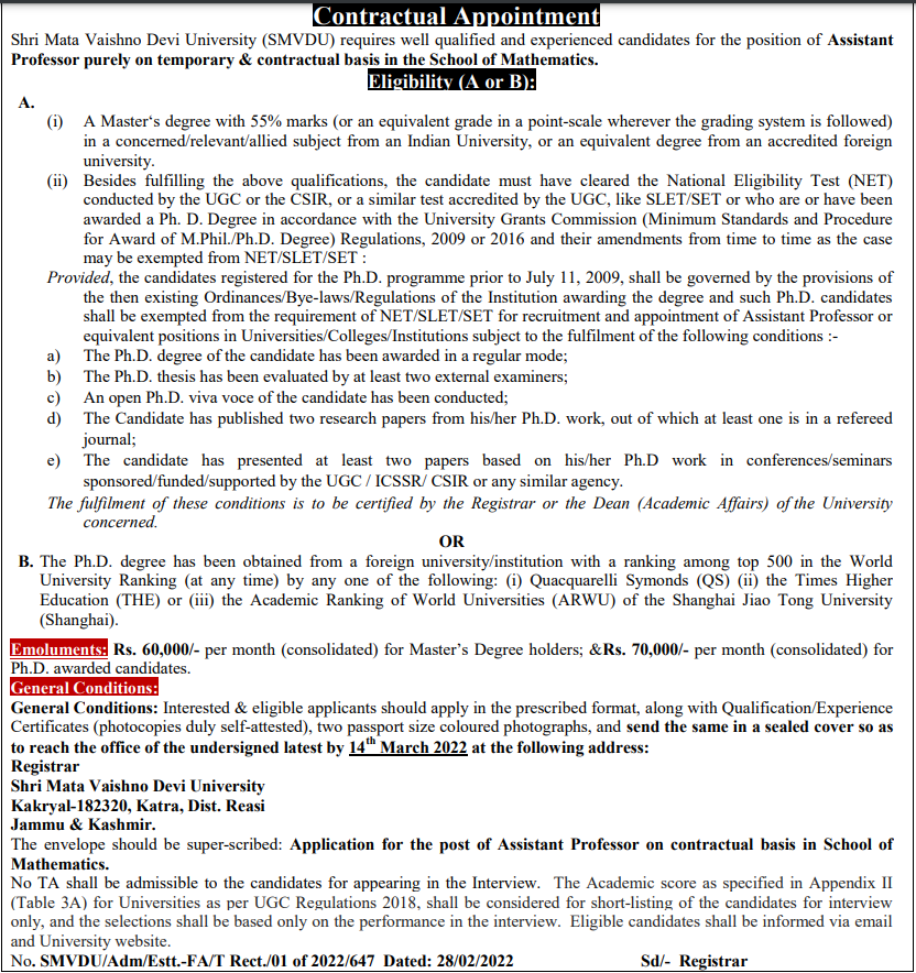 Interested & eligible applicants should apply in the prescribed format, along with Qualification/Experience Certificates (photocopies duly self-attested), two passport size coloured photographs, and send the same in a sealed cover so as to reach the office of the undersigned latest by 14th March 2022 at the following address: Registrar Shri Mata Vaishno Devi University Kakryal-182320, Katra, Dist. Reasi Jammu & Kashmir. The envelope should be super-scribed: Application for the post of Assistant Professor on contractual basis in School of Mathematics. |