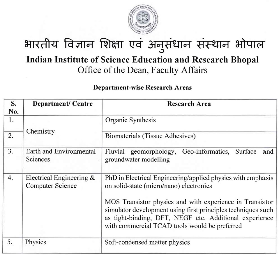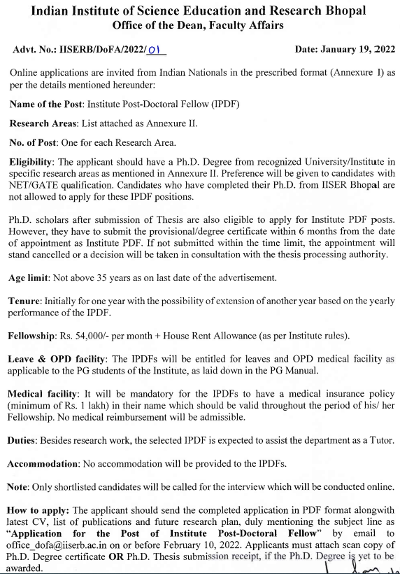 About- IISER Bhopal, an Institute of National importance, established by the Ministry of HRD, Govt. of India for fostering science education and research in frontier areas, invites applications for the vacant faculty positions in various departments in the specified areas only. Institute Post-Doctoral Fellow (IPDF)