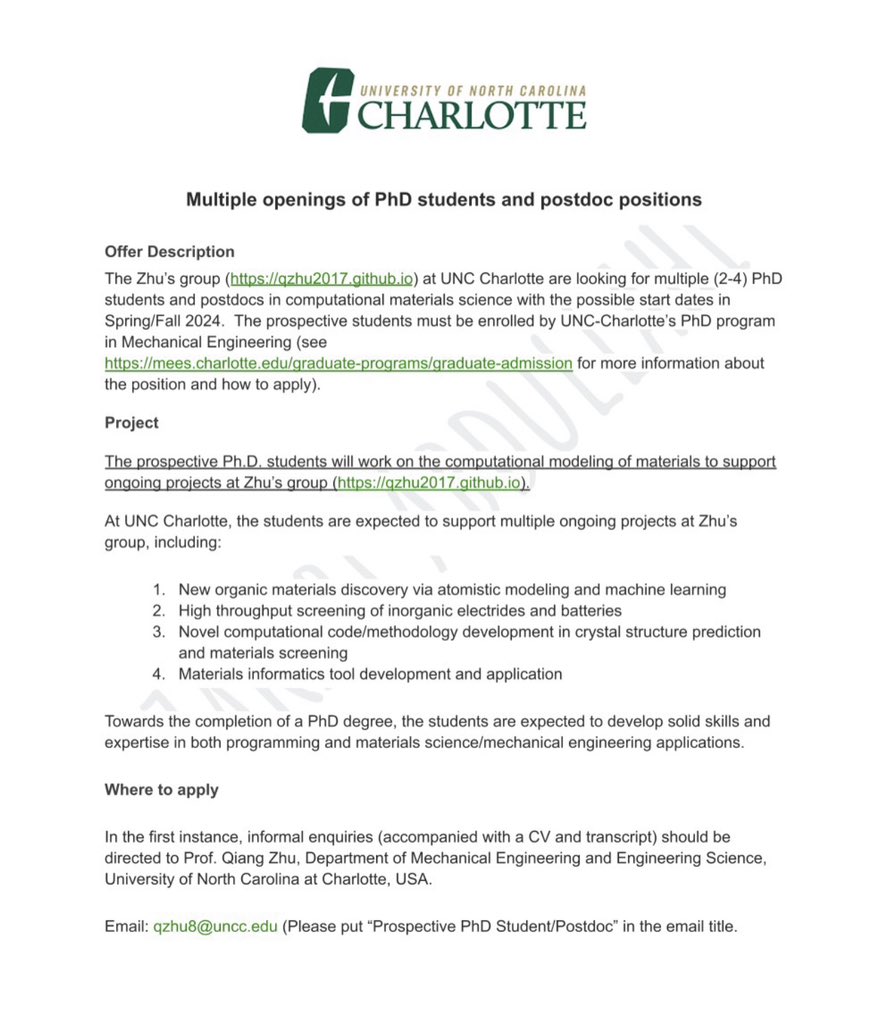 Multiple PhD Student and Postdoc: Join the Zhu’s Group at UNC Charlotte and embark on a journey of innovation in computational materials science. We have multiple openings for enthusiastic individuals to pursue their PhD or postdoc in this exciting field. If you are passionate about materials discovery, high-throughput screening, computational code/methodology development, and materials informatics, we encourage you to apply.