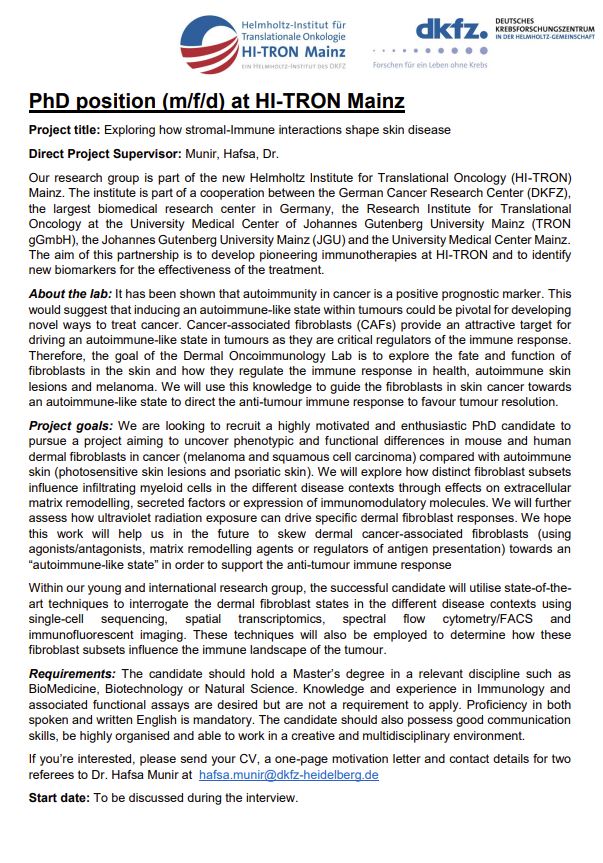 PhD Position in Dermal Oncoimmunology: The Helmholtz Institute for Translational Oncology (HI-TRON) Mainz invites applications for a PhD position in the Dermal Oncoimmunology Lab. The project explores how stromal-immune interactions shape skin diseases, focusing on cancer-associated fibroblasts (CAFs) and their role in autoimmune-like states within tumors. This opportunity is part of the cooperation between HI-TRON, the German Cancer Research Center (DKFZ), TRON gGmbH, Johannes Gutenberg University Mainz (JGU), and the University Medical Center Mainz.