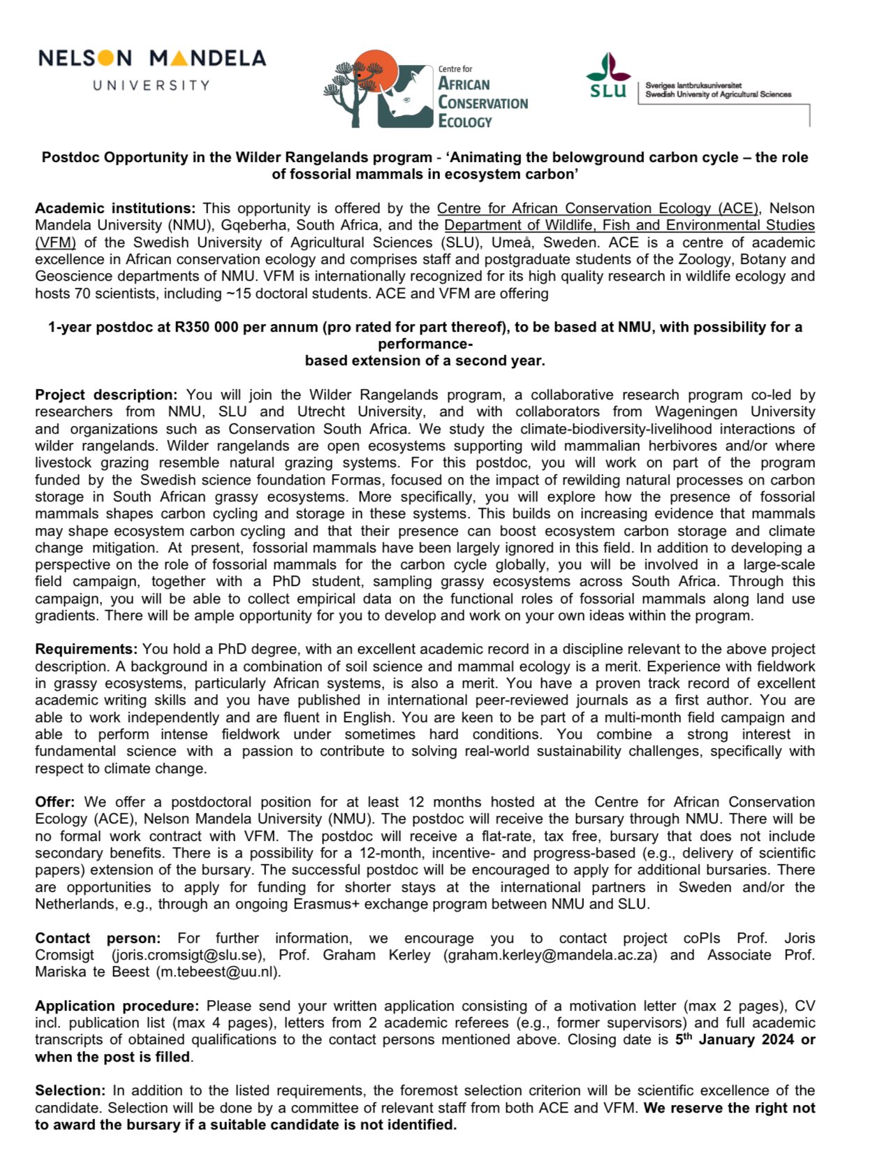 Postdoc Opportunity in Carbon Cycle: Nelson Mandela University and the Swedish University of Agricultural Sciences are offering a one-year postdoctoral position in the Wilder Rangelands program. The project, funded by the Swedish science foundation Formas, focuses on the impact of rewilding natural processes on carbon storage in South African grassy ecosystems. The postdoc will explore the role of fossorial mammals in shaping carbon cycling and storage and participate in a large-scale field campaign across South Africa.