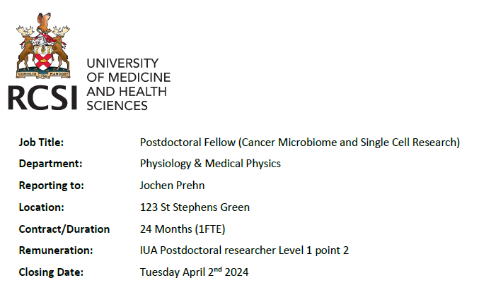 Informal Enquiries: Can be directed to Prof Jochen Prehn (jprehn@rcsi.ie). Please note CVs are not accepted directly.