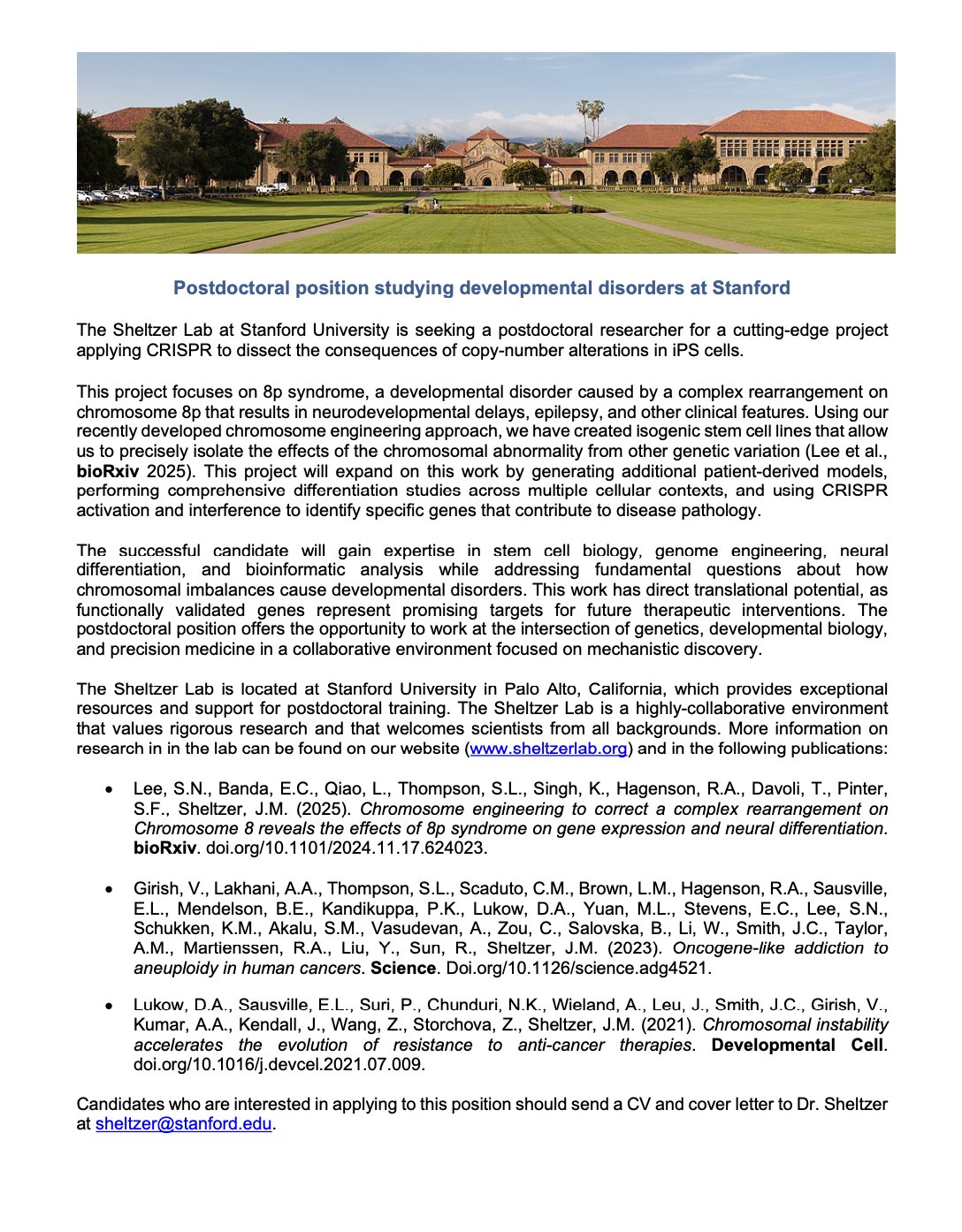Postdoctoral Position – CRISPR Biology: Here’s the heart of the opportunity. The Sheltzer Lab at Stanford is hiring a postdoctoral researcher to investigate how copy-number alterations drive developmental disorders. You’ll work with CRISPR, iPS cells, patient-derived models, and advanced chromosome engineering to uncover gene-level mechanisms behind 8p syndrome. The role blends genetics, stem cell biology, neurodevelopment, and precision medicine.