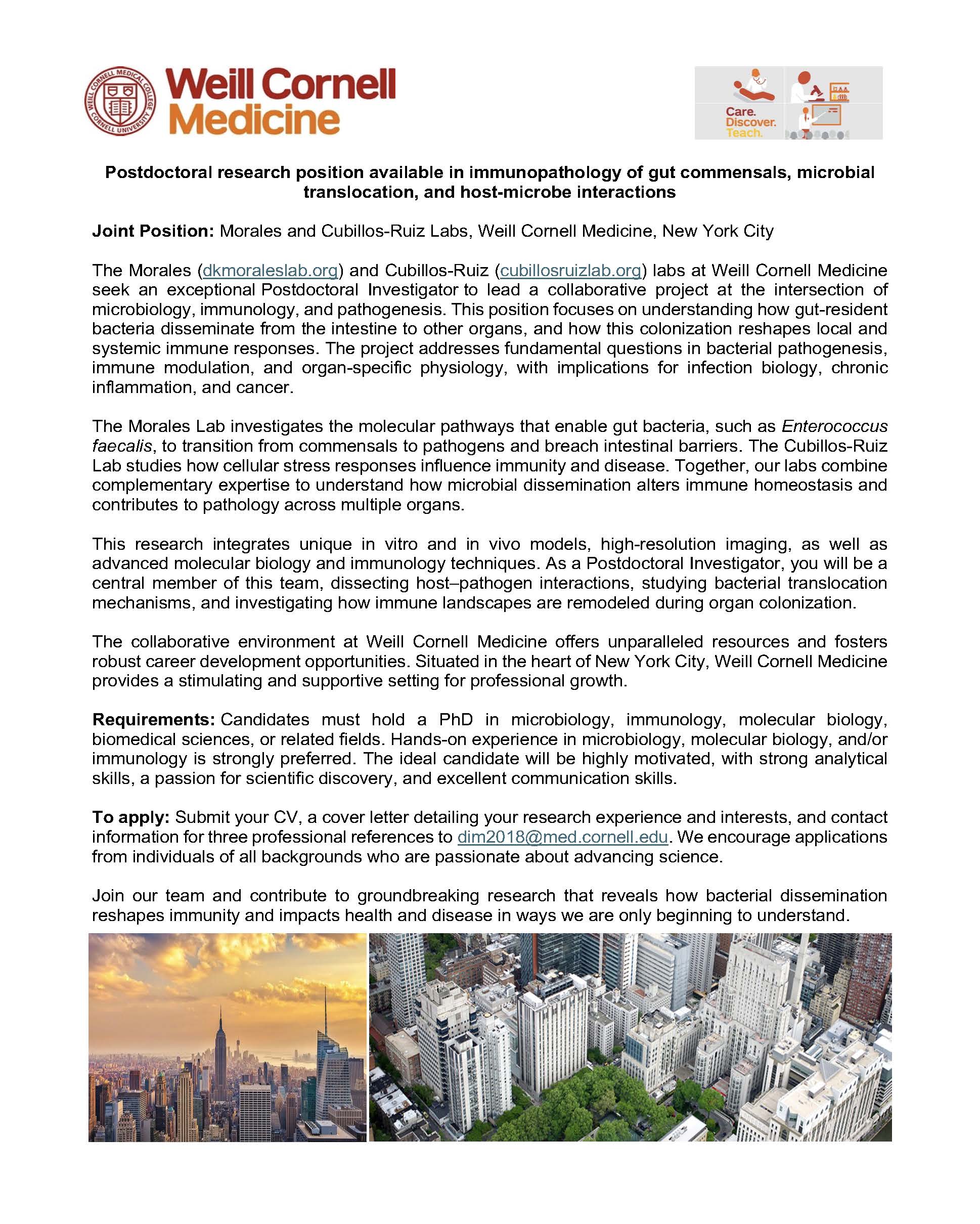 Postdoctoral Position in Immunopathology: The Morales and Cubillos-Ruiz Labs at Weill Cornell Medicine, New York City, invite applications for a highly motivated Postdoctoral Investigator to conduct collaborative research on immunopathology of gut commensals, microbial translocation, and host-microbe interactions. The successful candidate will investigate how gut-resident bacteria disseminate from the intestine to other organs and how this affects local and systemic immune responses using state-of-the-art in vitro/in vivo models and advanced molecular and imaging techniques.