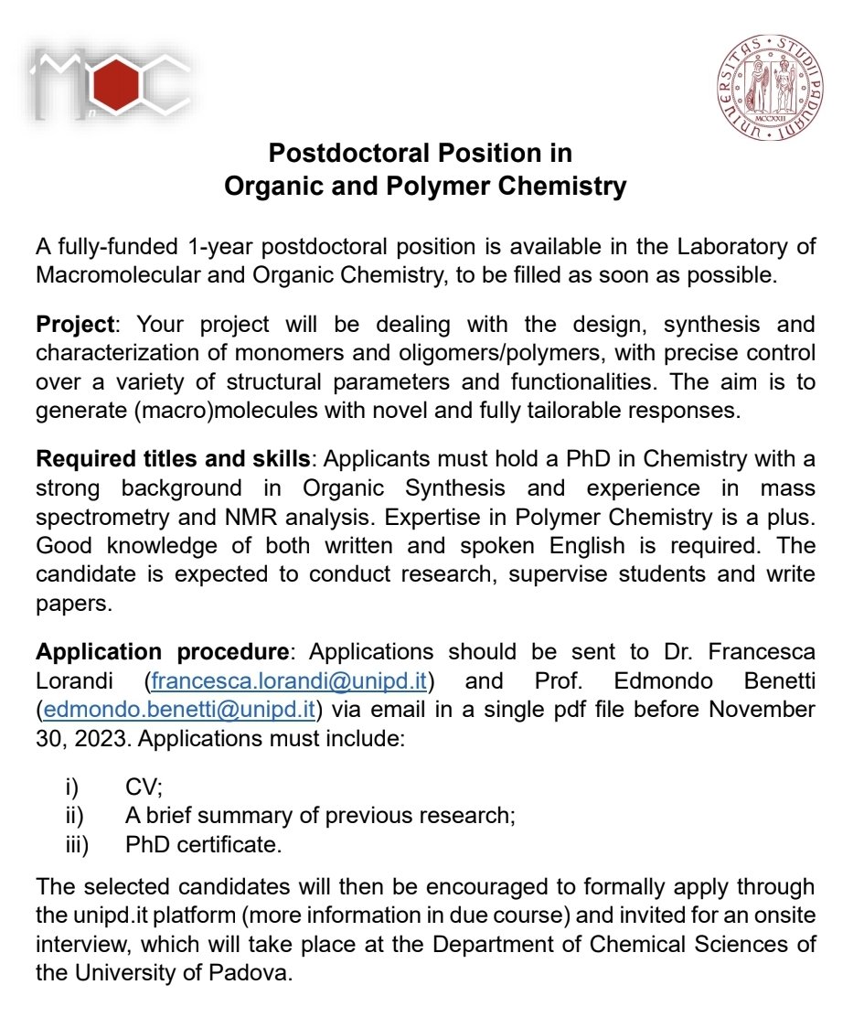 Postdoctoral Position in Organic and Polymer Chemistry: A fully-funded 1-year postdoctoral position is available in the Laboratory of Macromolecular and Organic Chemistry at the University of Padova. The project involves the design, synthesis, and characterization of monomers and oligomers/polymers, with a focus on achieving precise control over structural parameters and functionalities to generate novel and fully tailorable responses.