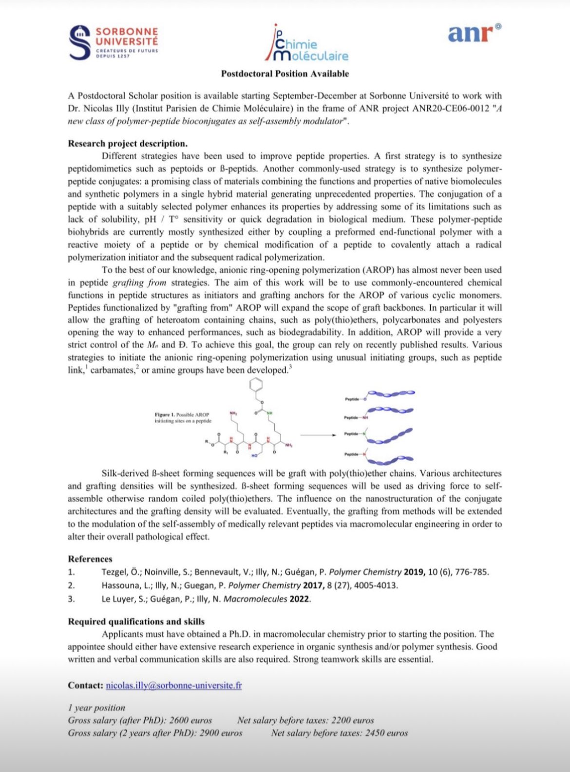 Postdoctoral Scholarship Position in Chemistry: Join the research project ANRIO-CEOG0012 â„¢4 at Scbomne University to work on the synthesis and assembly of polymer-peptide conjugates with novel molecular properties. This postdoctoral position focuses on developing strategies to enhance peptide properties by synthesizing pepidomimetics and exploring the conjugation of polymers. The research aims to improve the sensitivity, stability, and degradation characteristics of peptide-polymer hybrids.
