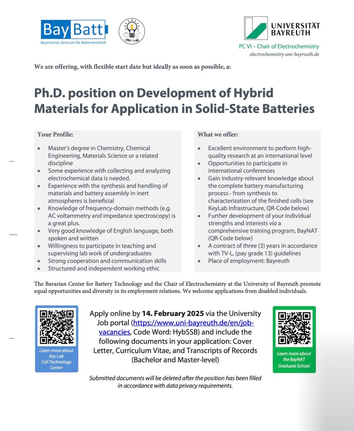 Research Associate in Hybrid Materials: The University of Bayreuth is inviting applications for the position of Research Associate in the development of hybrid materials for application in solid-state batteries. This is a fixed-term position to commence as soon as possible. Candidates will have the opportunity to work at the Bavarian Center for Battery Technology and engage in cutting-edge research in electrochemistry.