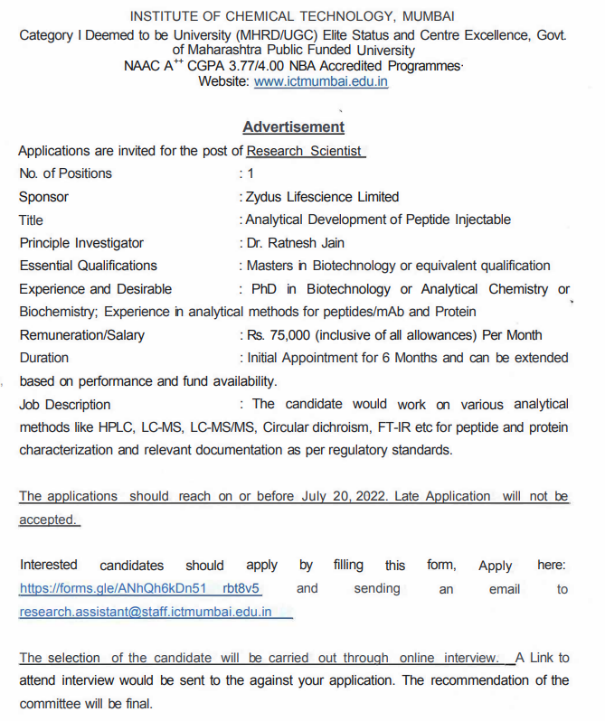 Institute of Chemical Technology (ICT), Matunga, Mumbai invites applications for Research Scientist Post at ICT from eligible and interested candidates