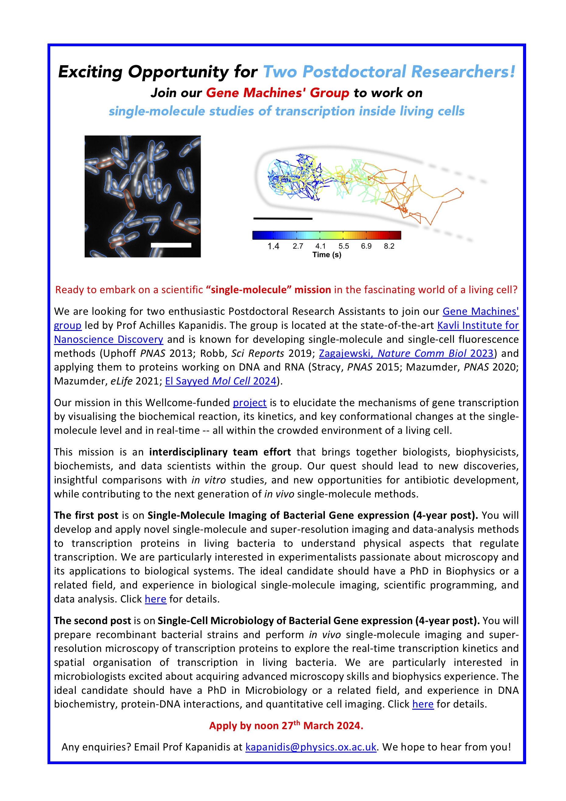 Contact: For any enquiries, email Prof Kapanidis at kapanidis@physics.ox.ac.uk. We look forward to hearing from you!
